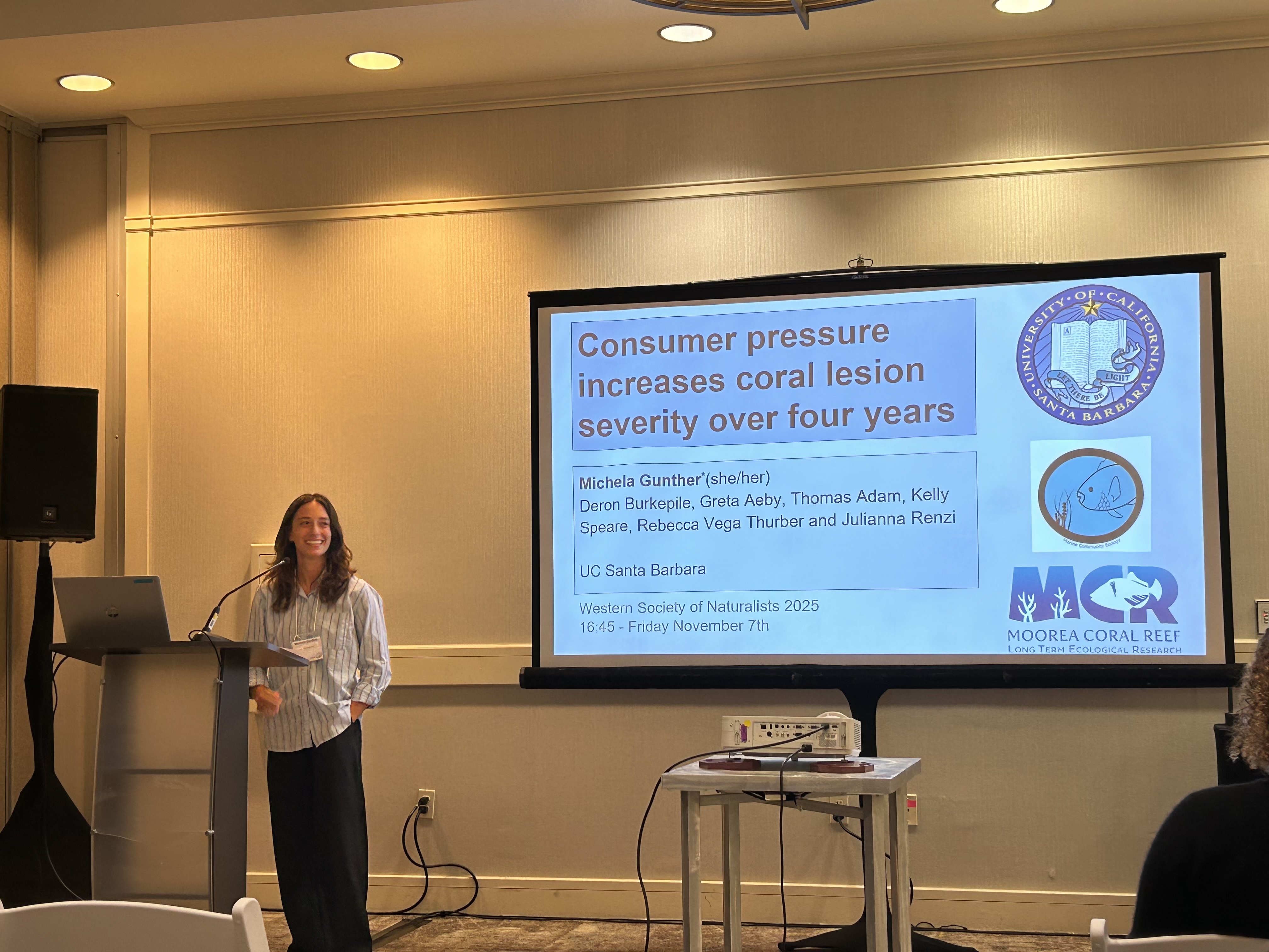 November 2025: Former UCSB undergraduate mentee (now at Fish & Wildlife) Michela Gunther traveled to San Diego last weekend to give a talk on her research examining the dynamics of red lesions in Pavona coral. Go Michela!